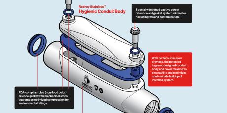 Robroy Stainless has engineered a complete hygienic raceway solution designed to eliminate contamination risks while maintaining industry-leading performance in food processing environments. Its patented hygienic conduit body and cover feature a shape with no flat surfaces, minimizing contaminant buildup and ensuring easy cleaning. The smooth, non-porous surfaces further reduce bacterial harborage, making sanitation more effective and efficient.
